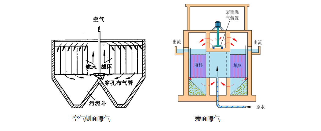 2. 如设计或运行不当,填料可能堵塞,此外,布水、曝气不易均匀,可能在局部出现死角。