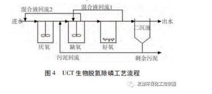 UCT工艺适用于处理 BOD5/TN或BOD5/TP较低的城市污水,当污水C/N<4、C/P <20时,UCT工艺比普通A2O工艺具有更高的除磷效率,UCT工艺增加了从缺氧段出流液到厌氧段的回流,增加了能耗,且两套混合液回流交叉不利于控制缺氧段的水力停留时间。